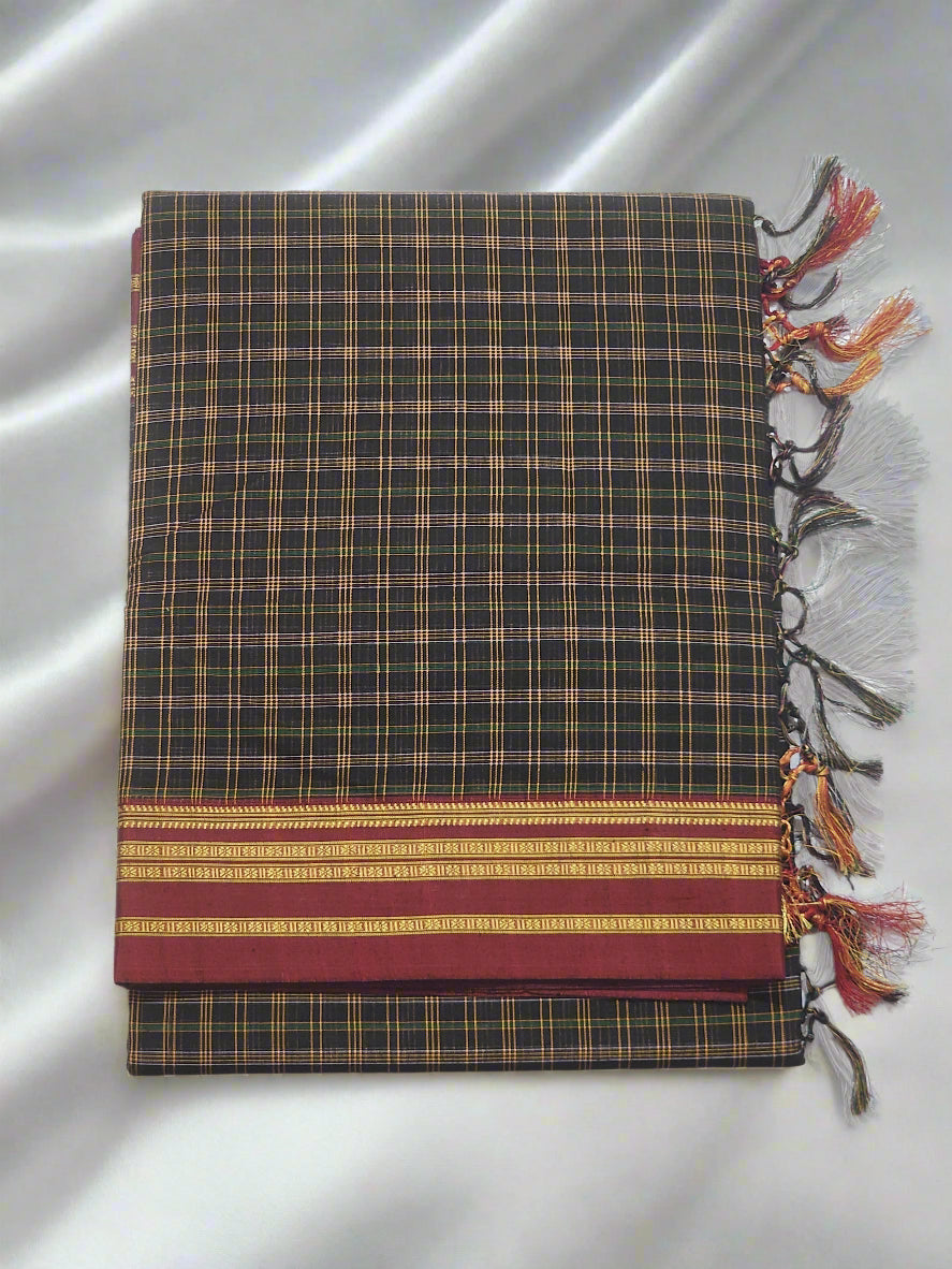 Rooted in tradition and rich in everyday elegance, this black Ilkal cotton saree is adorned with fine golden and white checks. The striking maroon border with traditional motifs in zari adds a classic touch, while the multicolored tassels on the pallu lend it a lively finish. Woven in pure cotton, it promises breathable comfort and effortless grace — perfect for daily wear, cultural gatherings, or festive moments.