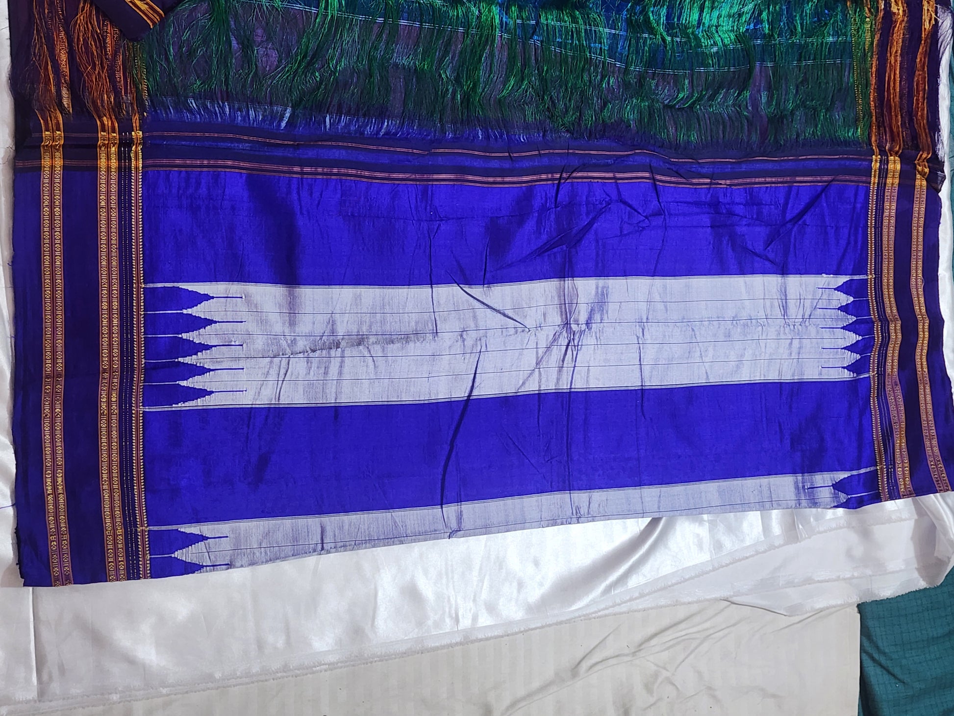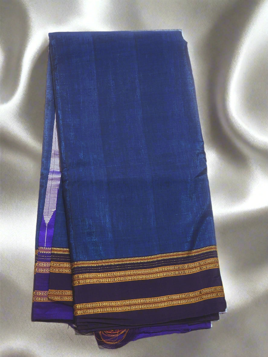 Elegant and vibrant, this royal blue Ilkal viscose silk saree showcases a rich, lustrous body paired with a deep purple traditional border intricately woven with golden zari stripes. The subtle sheen and lightweight texture make it ideal for celebrations, office gatherings, or special occasions where you want to embrace tradition with effortless grace.