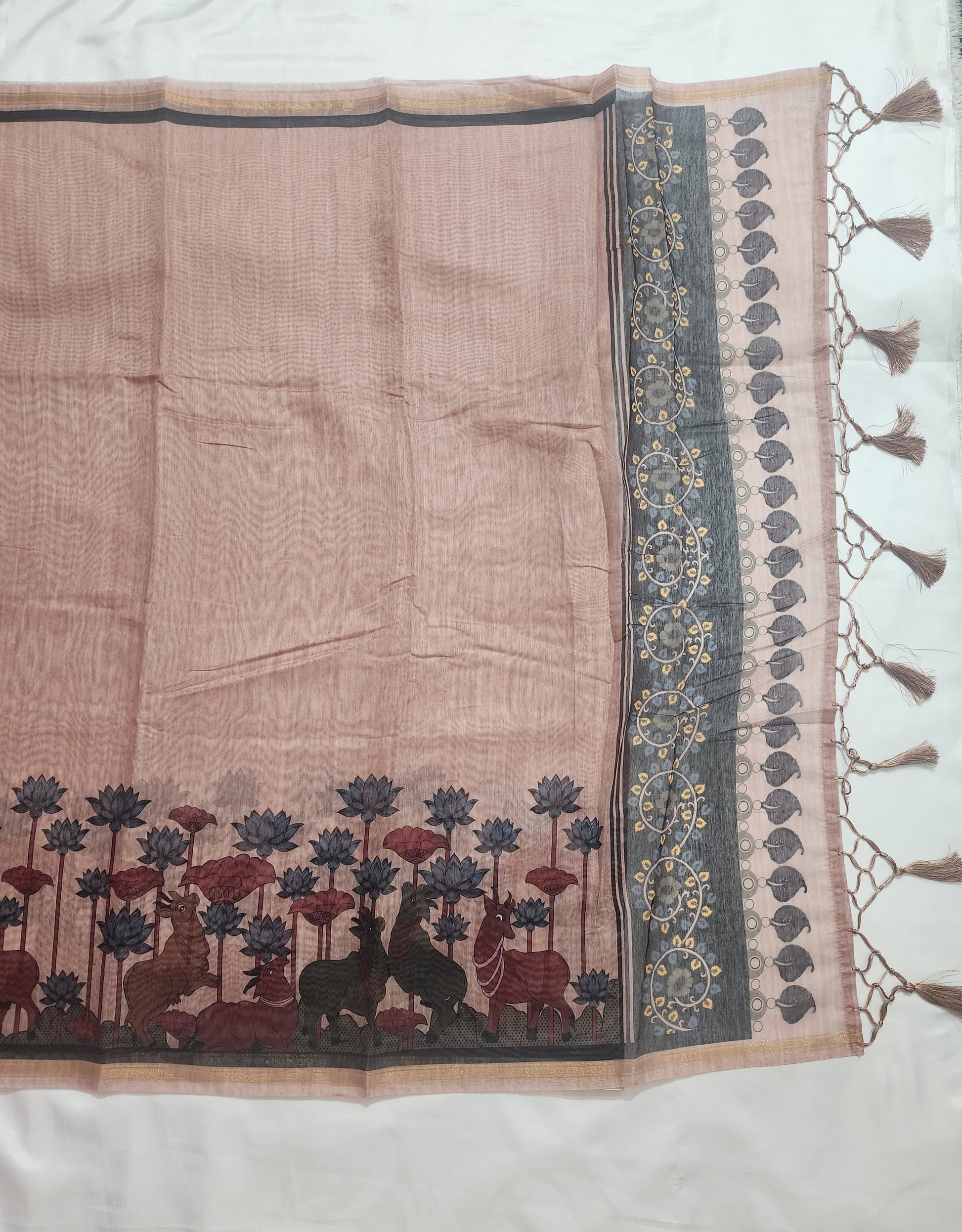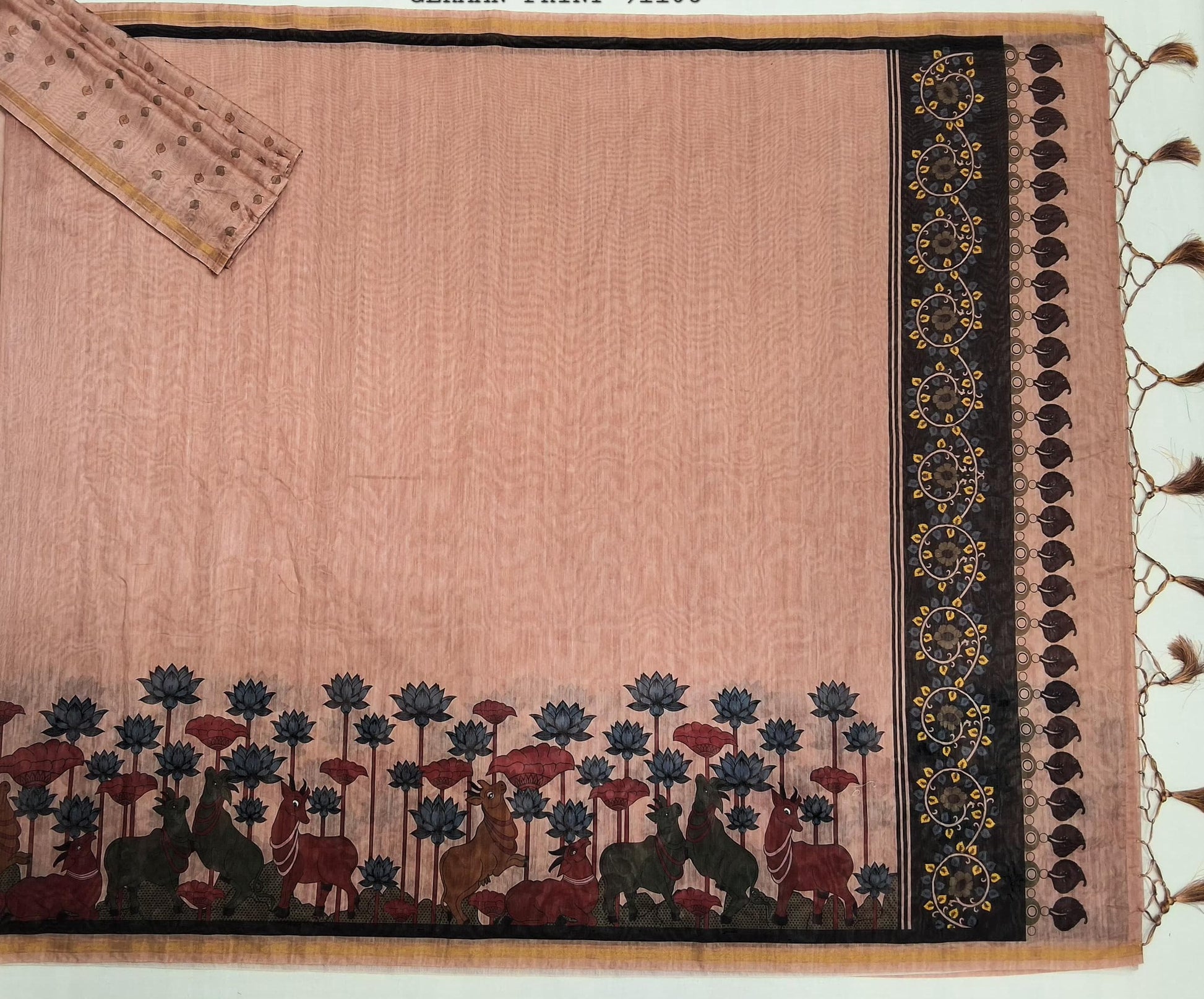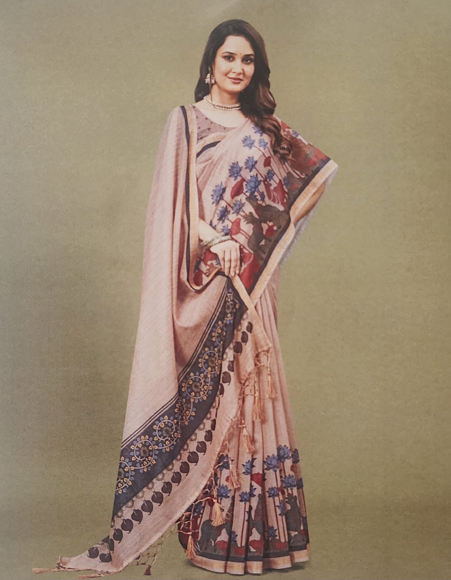 Whimsical yet rooted in tradition, this blush-toned German print saree features enchanting deer amidst blooming lotus flowers. The artistic rendering in deep earthy shades adds a storybook charm, making this saree a delightful fusion of folklore and fashion. Lightweight and elegant, it’s ideal for women who love a hint of narrative in their everyday attire.