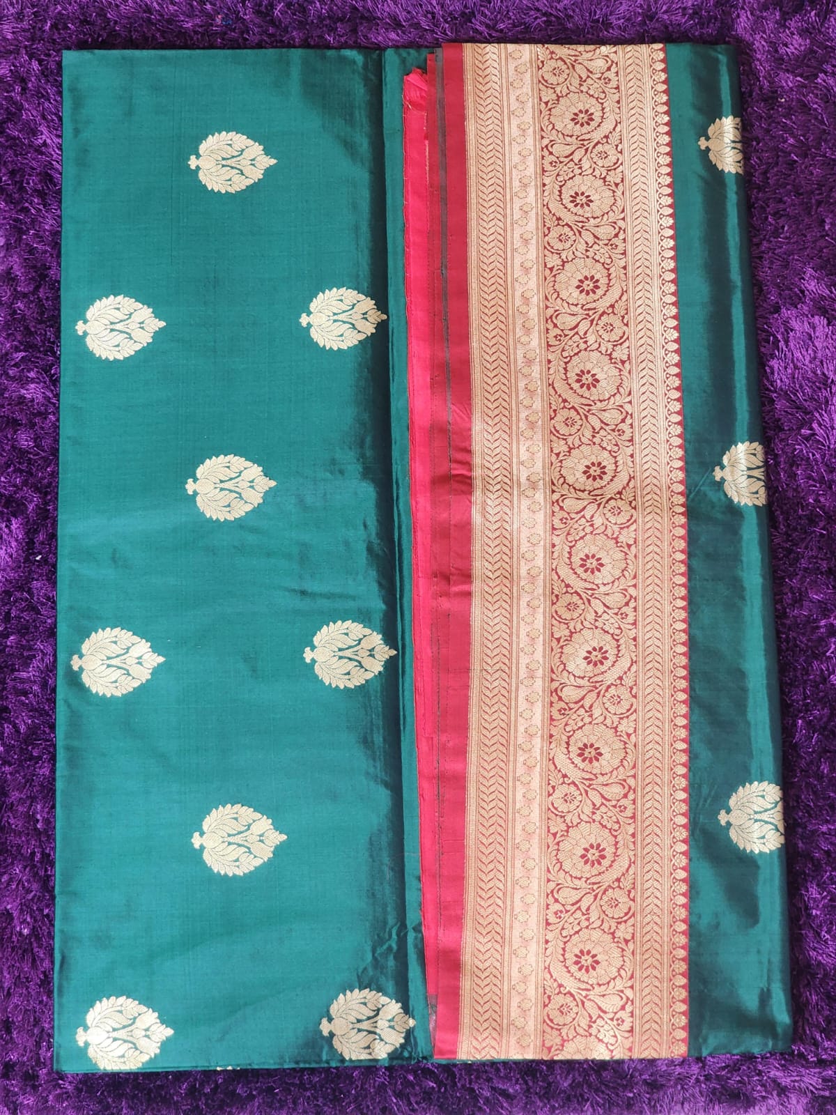 A splendid piece of heritage weaving, this bottle green Banarasi silk saree features elegant golden leaf motifs intricately woven across the body. The lush richness of silk combined with the glistening zari work makes it a perfect choice for grand celebrations, festive occasions, and traditional gatherings. A saree that brings together classic artistry and timeless beauty.