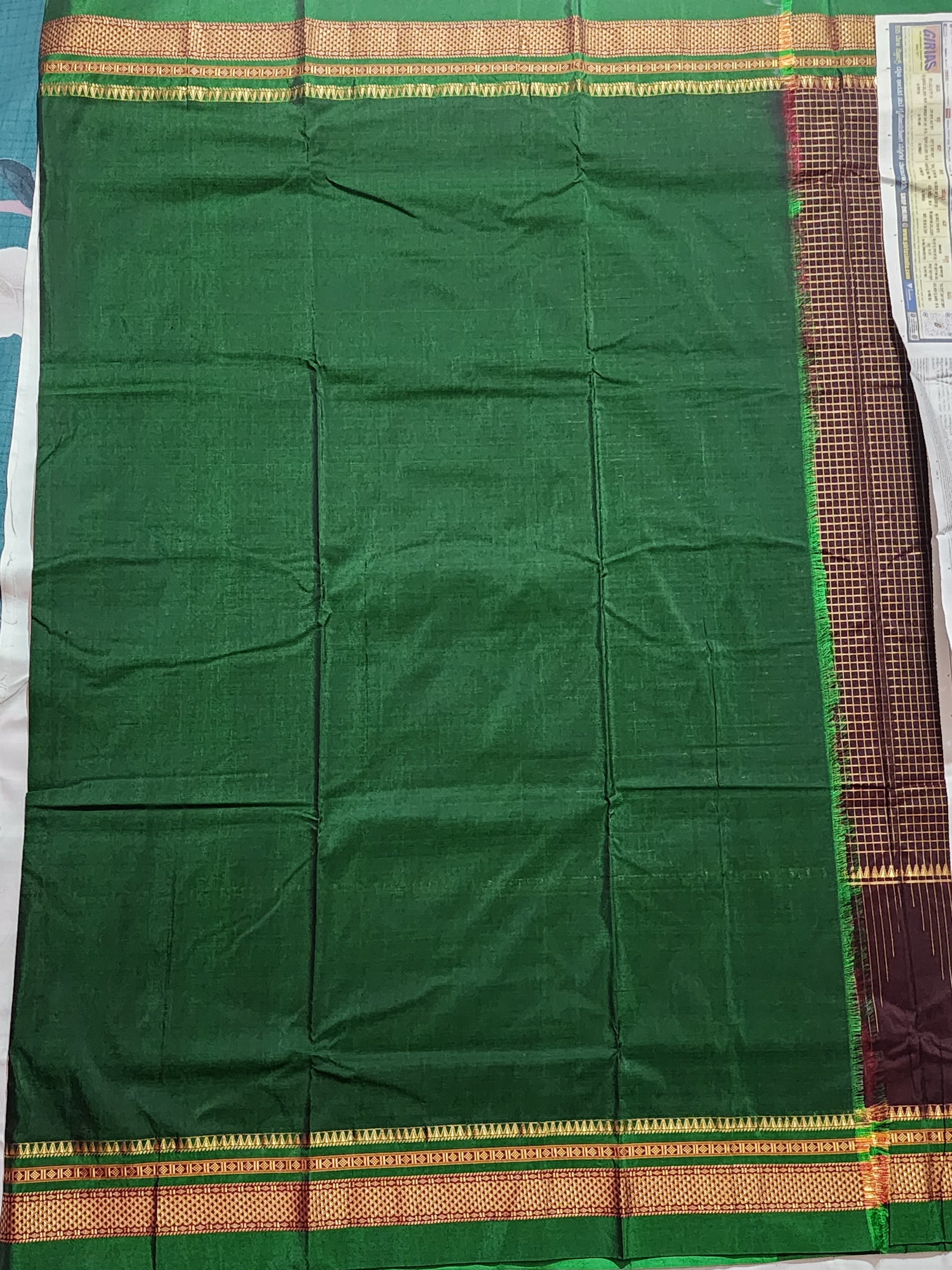 Rooted deeply in tradition, this beautiful brown Ilkal saree showcases an elegant checked pattern enhanced with striking golden lines descending into intricate temple motifs. The look is gracefully finished with a rich green border woven with classic zari work, bringing timeless sophistication. Crafted from a soft cotton-silk blend, the saree promises both comfort and charm, perfect for festive occasions, traditional gatherings, and cultural celebrations.