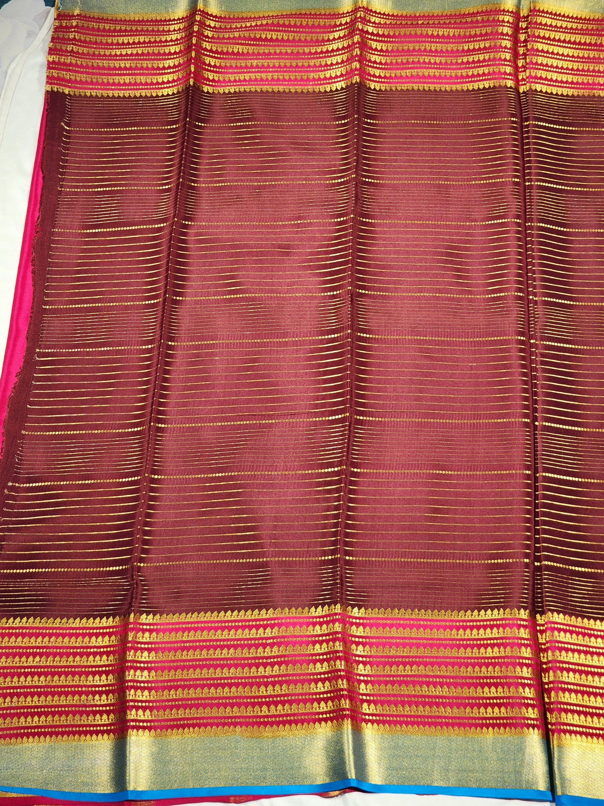 Brown Mysore Silk Saree with Golden Lines & Vibrant Zari Pallu