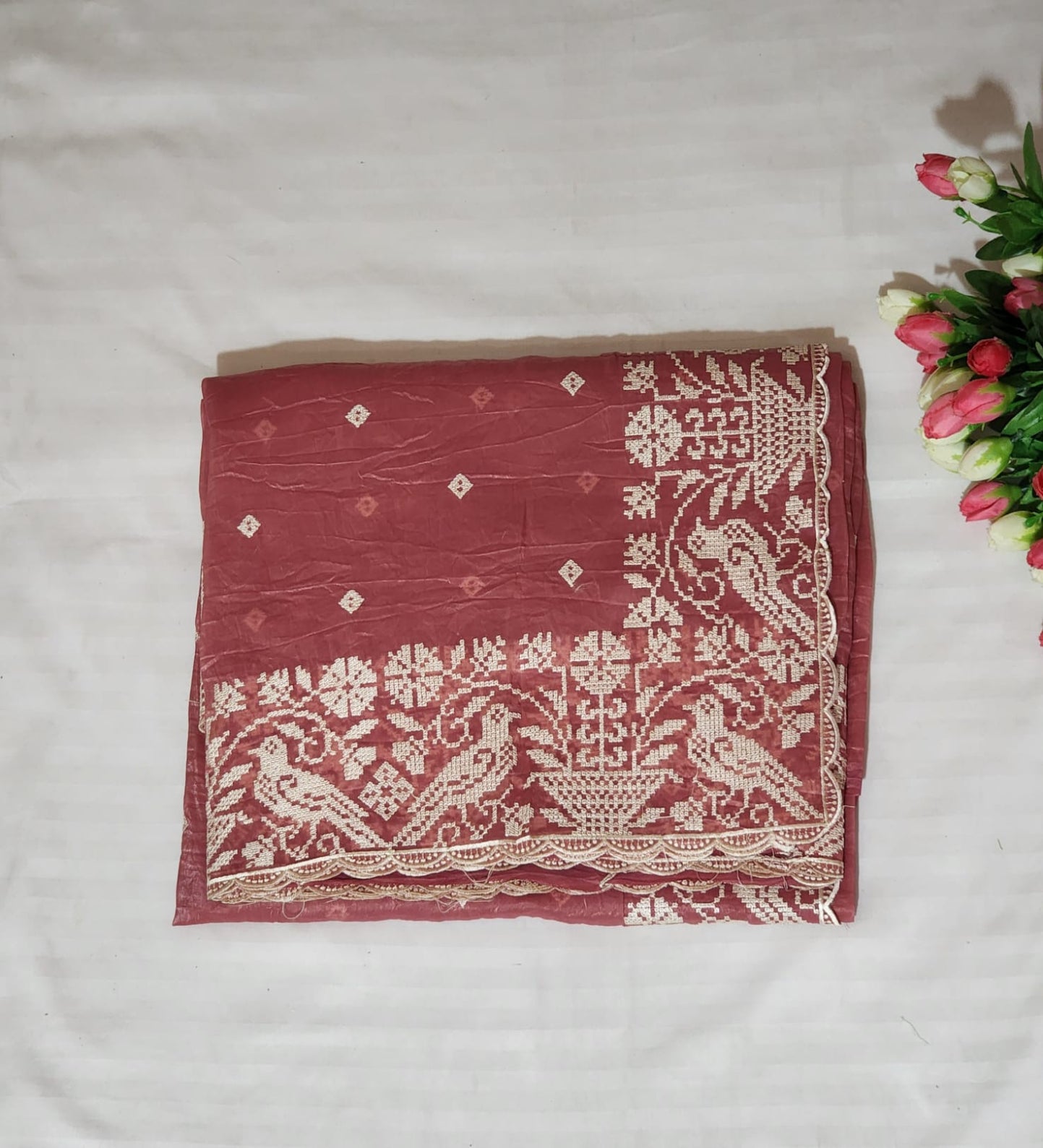 Grace takes flight with the Organza saree in deep blush pink, featuring intricately embroidered white peacocks and floral patterns along the border and pallu. This elegant drape is a perfect blend of tradition and sophistication, ideal for festive evenings, family gatherings, or cultural celebrations.