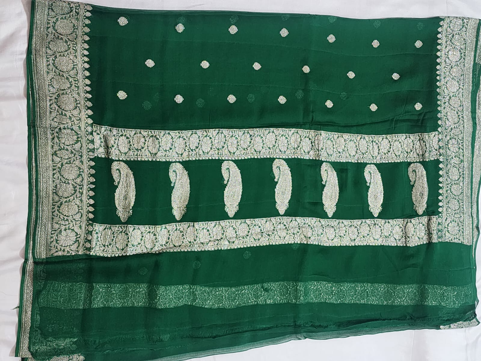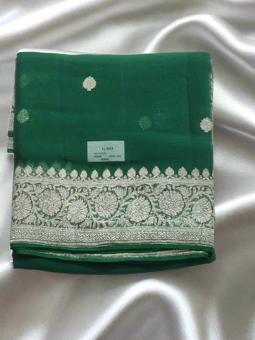 Emerald Green with Silver Zari Border Khadi Chiffon Banarasi Saree