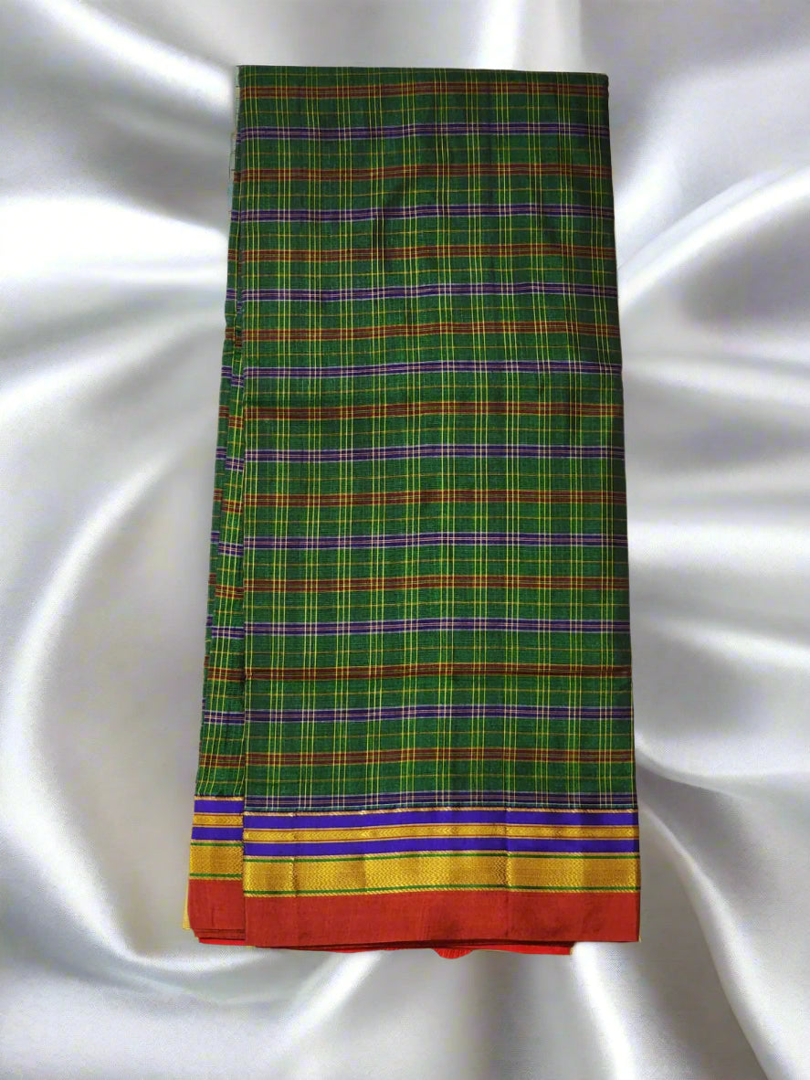 A beautiful blend of tradition and everyday elegance, this Ilkal Cotton Silk saree showcases vibrant green checks adorned with fine stripes of purple, orange, and yellow. The signature red, yellow, and purple temple-style border in pure silk adds a striking contrast, rooted deeply in Karnataka’s weaving legacy.