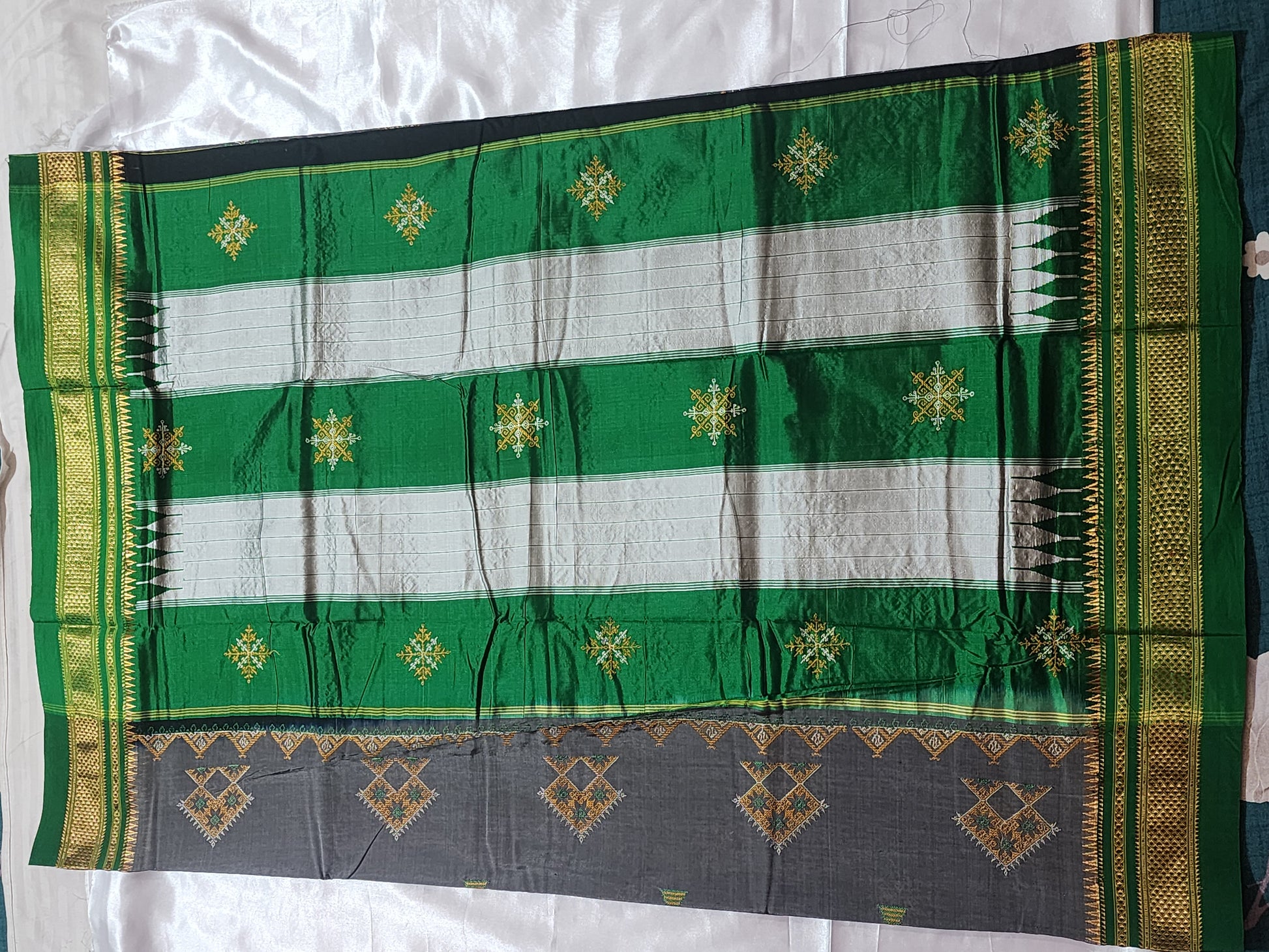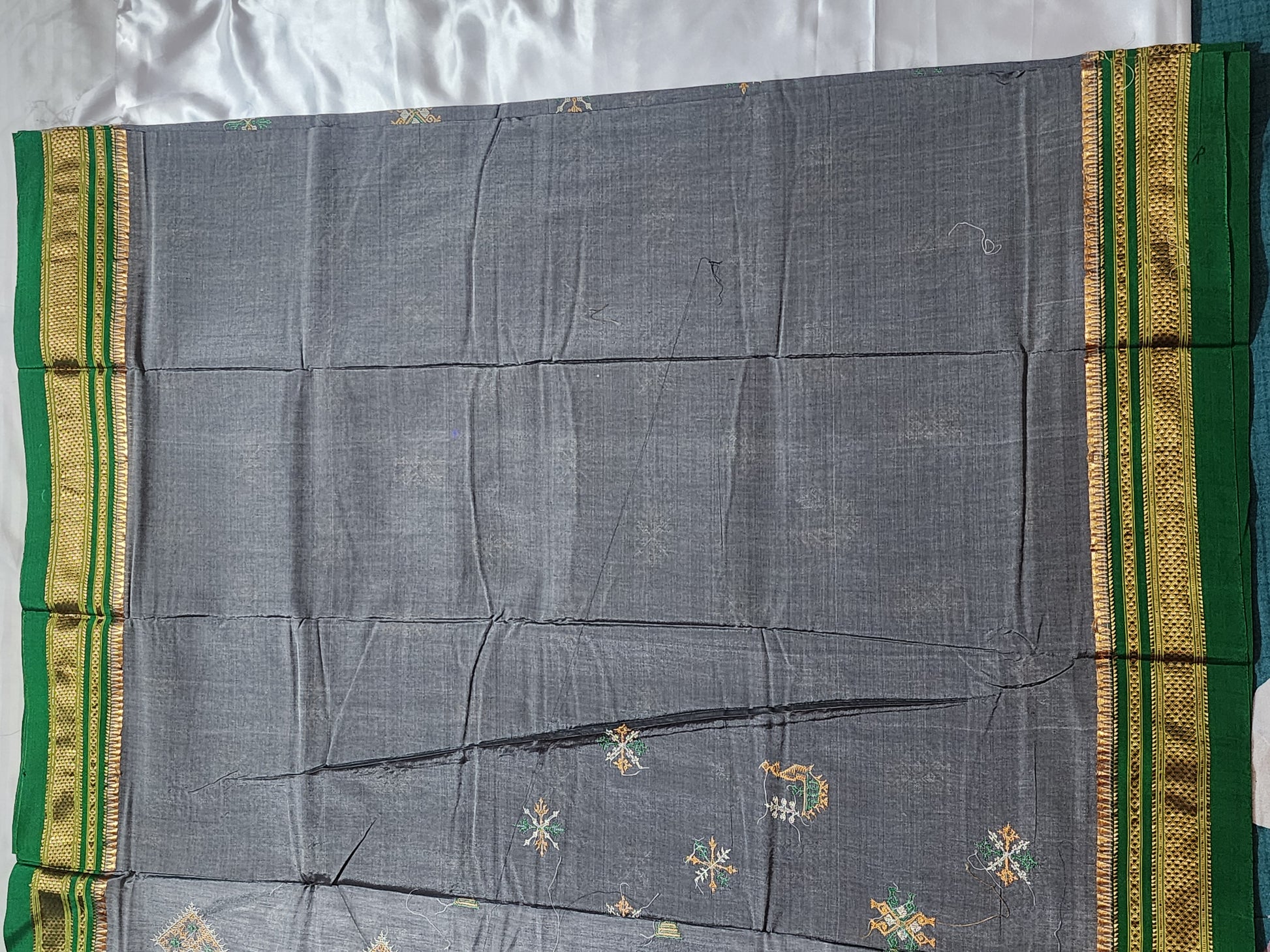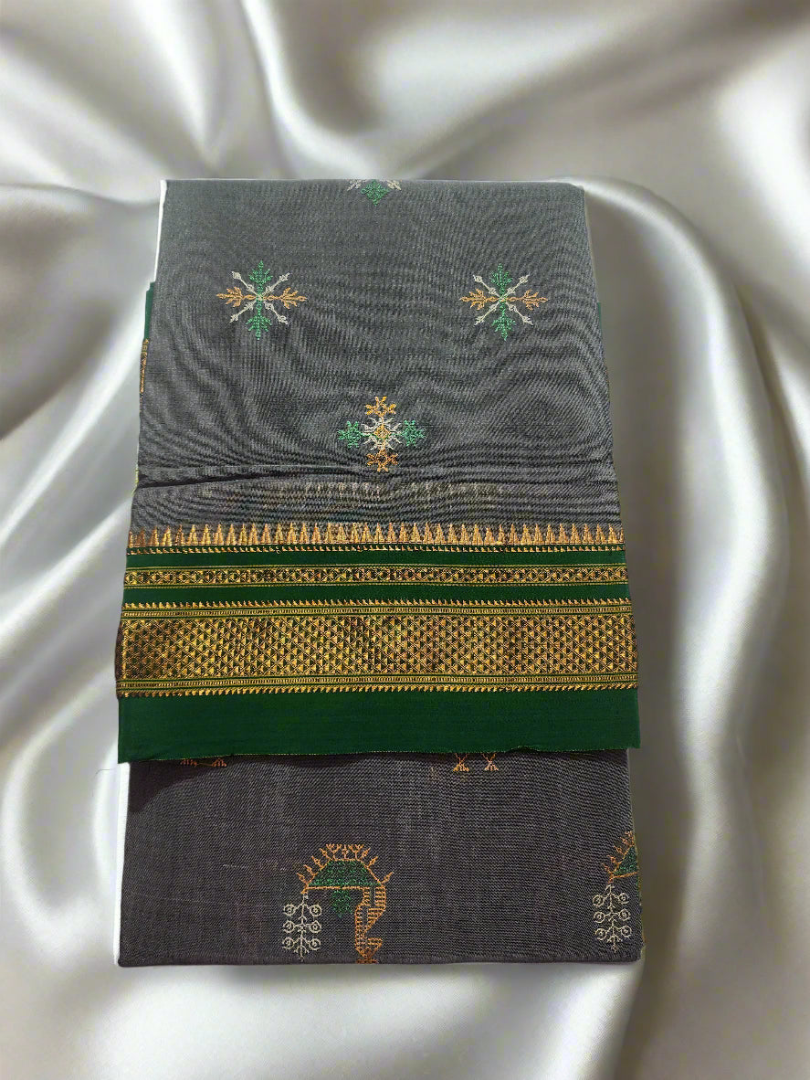Color: Grey Body with Green-Gold Border and Multicolour Kasuti Motifs