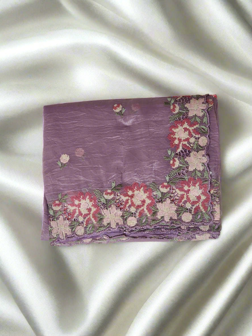 Lavender Purple with Multicolour Floral Embroidery Organza Saree
