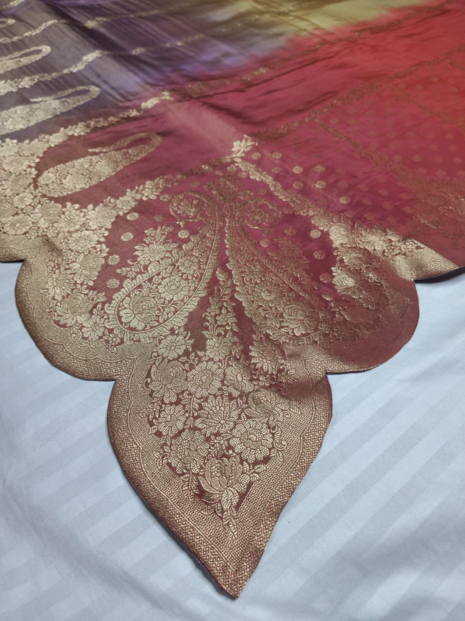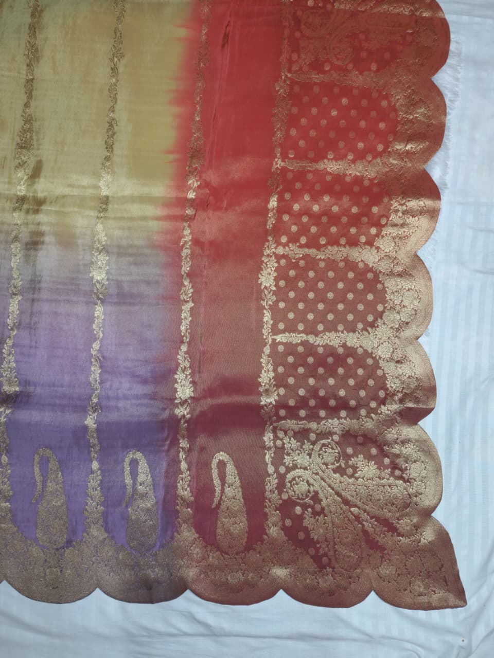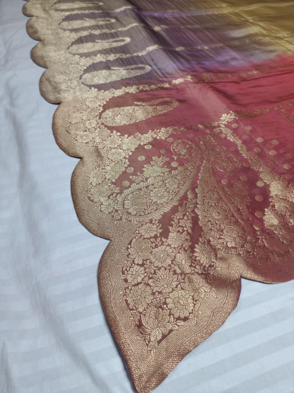 Drape yourself in timeless elegance with this exquisite designer saree, featuring a rich baby pink pallu and 4 shaded body adorned with intricately woven golden zari floral . The border is a true statement piece — a broad, scalloped design filled with dense floral zari work that exudes luxury.